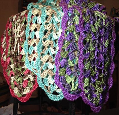 Open lace designed scarf. Simple pattern repeat. A great summer accessory - lightweight and not too hot.