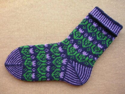 This is a toe-up sock with an afterthought heel. The pattern provides written instructions, with a chart for the colour work.