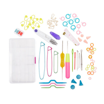 Contains\n\n2 x Row Counters\n10 x Plastic Locking Stitch Markers\n5 x Small Split Ring Stitch Markers\n5 x Large Split Ring Stitch Markers\n1 x Snips\n1 x Tape Measure\n10 x Metal Locking Stitch Markers\n4 x Small Point Protectors\n4 x Large Point Protectors\n1 x Small Cable Needle\n1 x Medium Cable Needle \n1 x Large Cable Needle\n1 x Small Locking stitch holder \n1 x Medium Locking stitch holder\n1 x Large Locking stitch holder\n8 x Small Ring stitch markers\n8 x Medium Ring stitch markers\n8 x Large Ring stitch markers\n1 x Tweezers\n3 x Darning Needles\n1 x Latch tool with spare hook\n1 x Double ended crochet hook\n1 x Compartment container with spare dividers