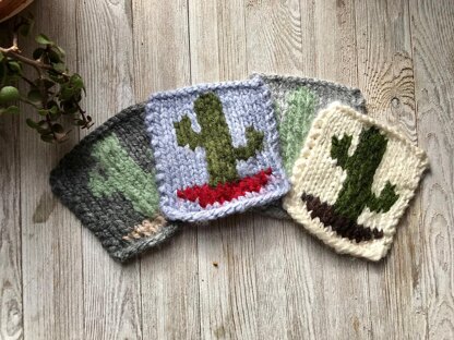 This pattern is written in standard English knitting terms. It also includes a chart for easy reading of the Cactus design. This knitting pattern uses bulky weight yarn and sizes US 8-5mm needles. You could knit a lot of these in a day. They make great coasters, patches, blankets, placemats, or appliques. Knit them as a set of coasters for a friend, Knit allot of them and seam them together to make a baby blanket or placemats. I was able to use up a lot of scrap yarn making these and it was fun to see how many fun color combinations I could come up with.