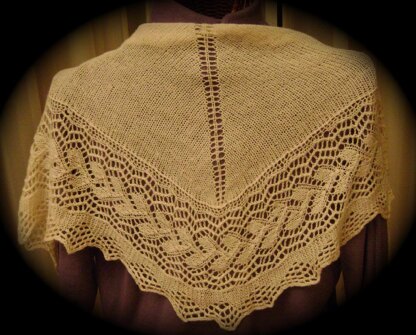 A simple little triangular scarf (which can be enlarged into a lovely shawl); stockinette in body, simple increases, very wide lacy edging. A rather quick knit in the size written; if enlarged to a shawl, it would still be a relatively simple exercise. It is lovely in its simplicity!