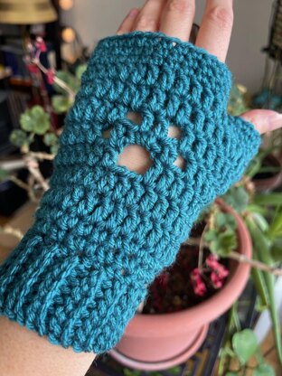 In celebration of NatCroMo 2022 and Crochetville’s NatCroMo Crochet Designers’ Blog Tour, whose theme this year is Paw Prints on Our Hearts, I’ve designed these fingerless mitts to keep you warm while walking your furry friend. They are made from the cuff up, all in one piece using slip, single, and double crochet stitches. Right now, instructions for only size medium are included, but sizes small and large will be added soon, and a new pattern substituted.