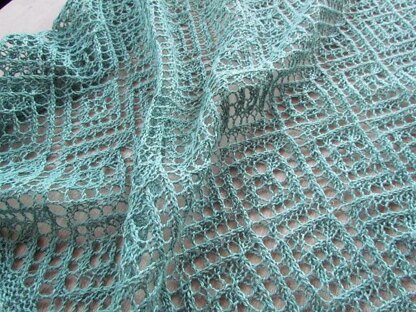Lozenge Lace Wrap and Scarf is a design of intertwined diamond motifs. It offers an open and airy pattern. The wrap model was knit both wide and long, however pattern instructions are included for a narrower wrap, as well as a scarf. Any yarn weight can be used by adjusting needle size accordingly. Pattern is written for lace weight.