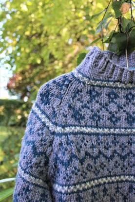 Ludvig is a sweater/pullover knitted from the bottom edge and up with a 3-color pattern om the yoke. The sweater has a raglan yoke, long sleeves and rib edges. The pattern is made for at yarn with a gauge of 18 stitches per 10 centimeters (stockinette stitch) i.e. a yardage of approimately 90 meters per 50 grams.