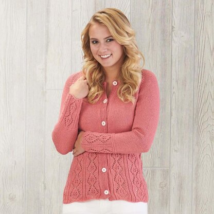 Lacework detailing adds a sweet feminine touch to this pretty cardigan. The body and sleeves are worked separately to the underarm, then joined together and worked together for the yoke, with raglan shaping.