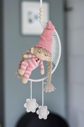 The advanced skill level pattern consists of two parts – making the doll, plus making the moon dreamcatcher. Both can be used separately as well, but together as a set they make a beautiful gift for a baby and a decoration for the nursery room.