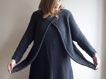 A very quick to knit sweater-wrap, and lovely to wear over clothing you don’t necessarily want to hide, the Luna Wrap keeps the arms warm, but let’s your favorite dress shine through. Though this is knit with a cotton, you could use any Aran-weight fibre to make this wrap.