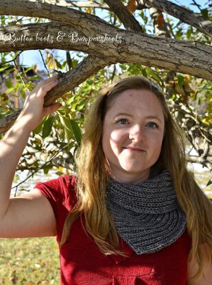 This cowl is worked flat and then seamed asymmetrically. It is worn with the seam to one side, with the top edge folded down toward the outside.