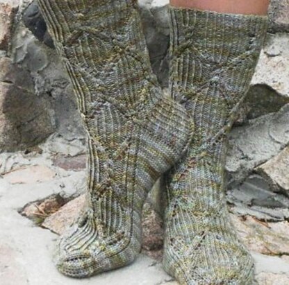 These socks are worked from the cuff down in a fingering weight yarn. The pattern includes written instructions and charted stitch patterns. Options are provided for short and long leg lengths and for three foot lengths.