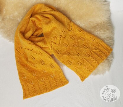Design details: ● long scarf ● with lace pattern on the edge and Stockinette stitch in the middle ● worked flat in two pieces, then the two pieces grafted together