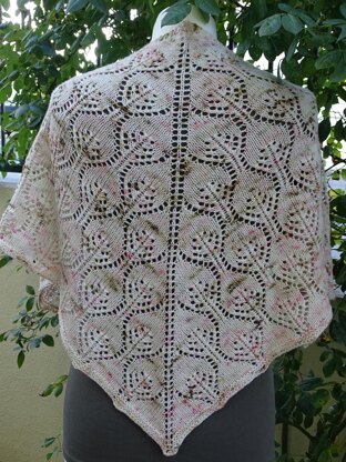 Macieira shawl is worked down and out from the center of the top edge, detailed instructions are given in two sizes but this shawl is completely adjustable. Final measurements depend on the number of times you work chart B. Shaping is done by working increases at the beginning and ending of each row and around the center stitch.