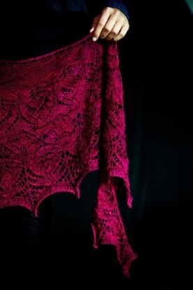 The lace motifs will challenge you as they are worked on both right and wrong side rows, while cables shift the fabric in unexpected directions. Nupp flowers and lines of decreases pick out lily motifs, or is it just the way the lace falls? Add beads, or don’t add beads – the choice is yours, depending on how you like your mad blood to drip.