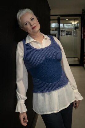 A very close-fitting sleeveless vest/slipover knitted in two tone pin stripes from the bottom up with shaped faux bustier, neck and armhole binding. Stitches are knit, purl, rib and slip stitch. Basic chart reading, colour work and a small amount of sewing is required.