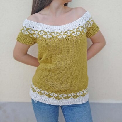 Tee is knitted in a round, top down, with colorwork placed on the yoke and on the bottom of the piece. Increases on the yoke are made with yo.