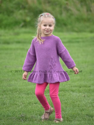 Magic Leaves Tunic is a "must have" for your little fashionista. The A-shape tunic is knitted bottom up in the round up to underarms, then the front and back are knitted back and forth separately. The frill and sleeves are knitted in stockinette stitch; the body of tunic is knitted in reverse stockinette with fancy leaves motif at front. The tunic is designed with about 17 cm/ 6½ inches positive ease.