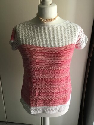 Il modello è strutturato in due parti diverse per il davanti e il dietro La parte davanti realizzata a due colori, la parte inferiore con un gioco di punti alti incrociati, la parte superiore con dei ventaglietti. La parte dietro lavorata in un unico colore ha la caratteristica dello scollo a v impreziosito da una serie di catenelle Nel tutorial viene indicato come realizzarlo nella propria taglia Per una taglia M/L è stato necessario circa 400 gr x entrambi i colori