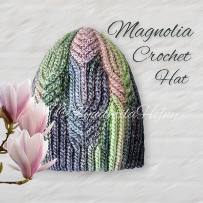 The Magnolia crochet hat is made vertically, flat, in one piece. Repeating panels are connected as you go. The Magnolia stitch pattern is created using short rows and slip stitches that are smoothly integrated into the ribbing with an optional fold available.