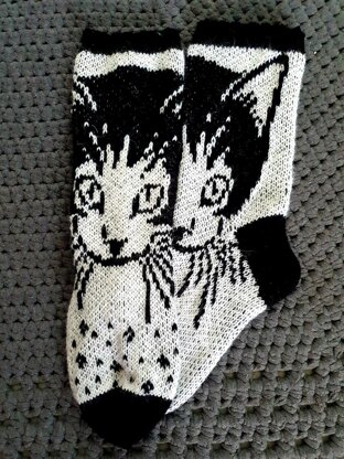 Cat socks knitted from leg to toe. The first chart is for the leg and the second for the toe. The ribbing, reinforced heel and toe are knitted in black. The image on the left sock is a mirror image of the right sock. Continue the chart immediately after the reinforced heel, otherwise the picture will break.