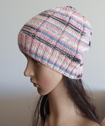 This Beanie has a 2x2 rib brim then is worked in a 10x2 rib. Use a flat seam to make the Beanie reversible, or choose which side you prefer and make that the right side. This self-patterning yarn makes the work look fancier and more complicated than it really is.