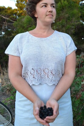 A drapey and boxy tee with three options for length; cropped at the waist, hip length, or a mid thigh shift dress. Knit in the round from the bottom up starting with a beautiful inverted scallop lace hem, the tee continues up without waist shaping for a relaxed fit. The front and back are separated and dolman sleeves are cast on. Attached i-cord is worked on the edge of the sleeves and neck for a neat finish and a scoop neck makes this easy to slip over the head. Kitchener stitch joins the shoulders. Knit in a lovely hand dyed linen this tee is perfect for long hot summer days. Simply throw it in the washing machine after a day in the salt, sand and sunshine. The linen will only get better with every wash and wear.