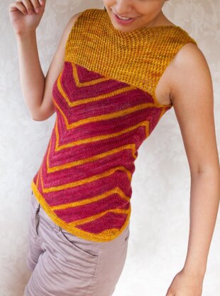 The Maia Tee is the result of dabbling in unusual garment construction methods. Diagonal, converging stripes and the bias construction of the body piece accentuate the body’s curves and lines and the sleeve-less mesh give the piece a flirtatious look. This unique tee will make for a fun summer wear!