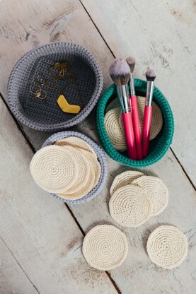 Crochet pattern for 3 different make-up pads + 3 pots in different sizes. These reusable and washable make-up pads (or scrubbies) are a joy to make and a eco-friendly and cost saving alternative to disposable pads. Use (undyed and natural) 4ply/fingering weight cotton yarn for soft and high quality pads.