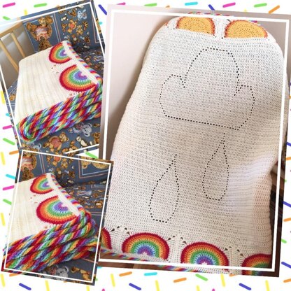 This blanket is made up of sunshine and rainbow panels together with a large filet crochet section forming the cloud and raindrops. There is a chart and written instructions for the filet crochet section, the sunshine and rainbow panels are a written pattern only (no chart).