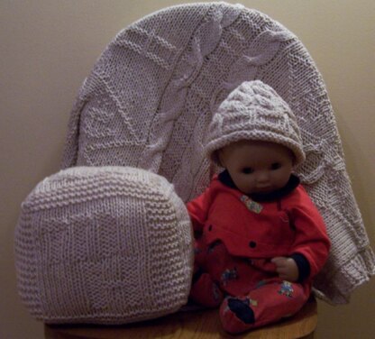 This set is a one-of-a-kind creation for that special new baby! Designed for a washable organic cotton in worsted weight (the sample is done in Knit Picks Simply Cotton Worsted in Malted Milk) this is an easy care, cozy, fun-to-knit set that goes together quickly on #10s. The knit-purl sts and cable columns make a fun texture for the baby! The toy cube is soft and squishy and has some bells buried deep inside to jingle and make the baby giggle.