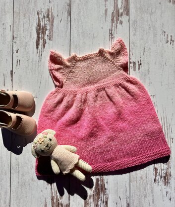 Top-down construction, with a fitted chest, full princess skirt and ruffle sleeves.