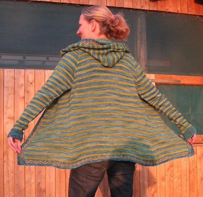 MaLoMa is a cardigan with raglan-yoke, positive ease and a flattering shape. The hood and the body are worked flat, the sleeves and the edging are knitted in the round.