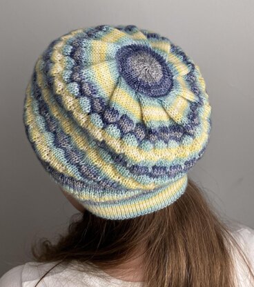 The hat can be worked on any needles used to work small circumferences in the round, but for the pleated decreases, an additional two double-pointed needles are required. A photo tutorial also is included for this special decrease.
