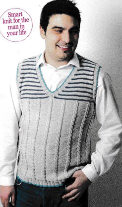 This is a pattern for a man s cable and stripe tank top, originally published in Lets Knit. I don t have the issue but it will be in the months following Nov 2009. It has a simple cable repeated on the main part with a striped yoke, rib edges. The yarn has been discontinued, any yarn knitting to the tension can be used. Photos lets Knit.