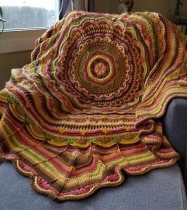 Colorful mandala pattern that includes a lot of rows of scallops that keep the throw bursting with colors. Mandala Berry Scallops pattern is included in this pattern. The overall size is 61" square, but you can stop the pattern whenever you want to. The amount of yarn needed for each individual row is specifed based on the yarn used in this pattern. This will help you determine how much yarn you need of colors you want to use. The number of skeins used for this pattern: Saffron - 3 Gingerbread - 3 Shrimp - 2 Apple - 2 Gold - 2 Copper - 2 Sunshine - 2 Tomato - 2