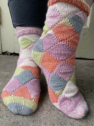 Yarn: Self striping yarn is recommended. Sock size, stripe length, starting point, and gauge variations will impact how the stripes align with the individual diamonds.