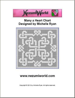 Interwoven knotwork different sized hearts chart (with first row is written for both a 1 x 1 & 1 x 2 filet crochet grid). Additional information sizes using different yarns is also included. i.e. Using Crochet Cotton Thread size 10: approx. width = 18.2 inches, height = 19.8 inches, Using Worsted Weight Yarn: approx. width = 71.1 inches, height = 72.7 inches. Uses American crochet terms. This makes a beautiful table setting, chair back or lapghan (depending on yarn/ thread used) for your home.