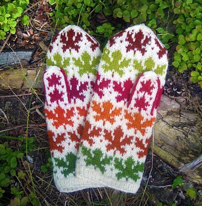Handfuls of maple leaves, just in time for Fall. Simple construction, afterthought thumb. Great for gradient yarn, or for using up different color yarn leftovers. I think it's also going to look interesting on dark brown or black background (like fallen leaves). Use fingering-weight yarn for sizes S/M, or sportweight for larger sizes. My special thanks to Marit (Mitt) for knitting such a beautiful sample pair!