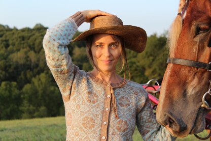 This is a pattern for a adjusted dropped sleeve cardigan. It is worked from the bottom up and in the round with multiple steeks. if you are using a 7 st steek, any reinforcement should work well. However, if you are using smaller steeks, machine sewn steek reinforcement is suggested with Gerty yarn. There are 3 rounds using 3 colours. There is no waist shaping for this project.