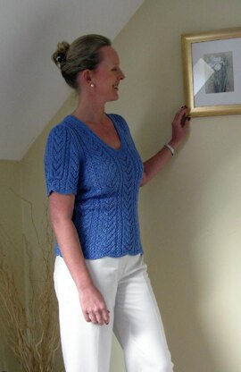 This summer top is knitted in a lace and mock cable pattern using a bamboo/wool mix yarn. To create a more fitted shape I used a change of needle size for the waist shaping rather than decreases and increases.