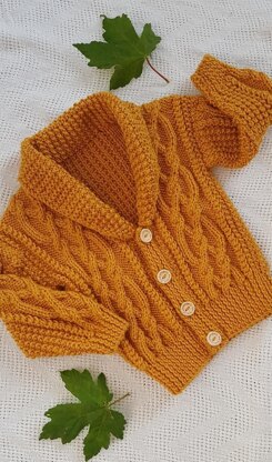 “Mark” is a beautiful Aran knit with a lovely cable. It has a striking shawl neck for extra cosiness and requires some skill.