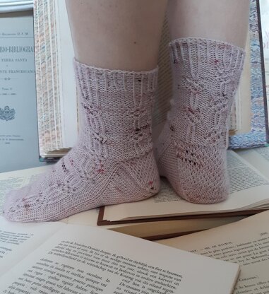 Marque-page socks are feminine socks, adorned with a motif made of twisted stitches and mock cables, which climbs on the top of the foot. Another version of this motif is used on the back of the ankle. These motifs are explained by charts.