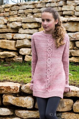 The tunic is worked top down. It begins with creating a round neckline in the front. At the same time yoke and sleeves are worked by increasing stitches with different pace. When the yoke is formed, sleeves are separated from the body which continues to be knitted in round till the hem. Then front and back are worked separately till the end. Sleeves and neckline are worked in round by picking up stitches from the edges. No seaming required.