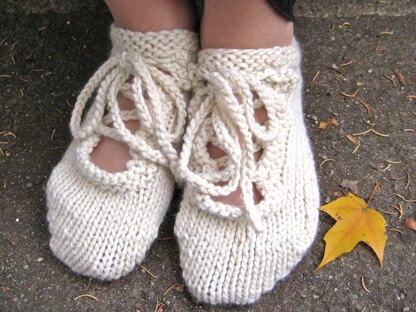 The slippers shown in the pictures were left plain, but set your creativity free and think of the many ways to embellish your pair for something completely unique. How about a flower on the toe? A small patch sewn on the heel? Initials or a small design done in duplicate stitch? Leave the laces off or substitute ribbon for the crochet chain.