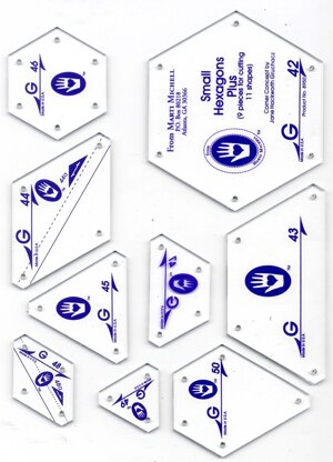 We measure hexagons based on the length of a finished side. This template set is based on 1- and 2-inch hexagons, measured on a side, plus companion shapes. Sets G and H instructions sheets both include many classic 60-degree patchwork deigns and steps for using the templates as rulers for rotary cutting perfect strip widths.
