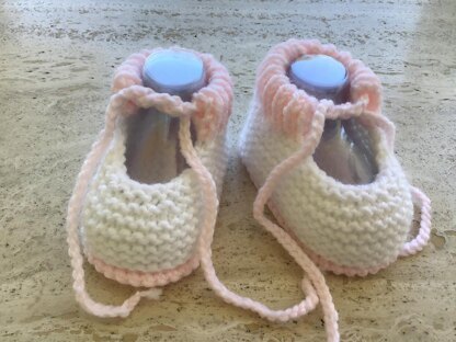 Mary Jane Lace Up Baby Shoes - This Pattern Is Made on Two Needles in One Piece It Does Require A Small Amount Of Crochet. Pattern Makes Three Sizes of Shoes 0 to 3, 3 to 6, 6 to 9 Months. Quick And Easy.