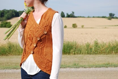 The vest is knit seamlessly, working the back and fronts in one large flat piece. The right shoulder is grafted together with a three-needle bind off, and shaping for the left shoulder is done with short rows, after which the knitting flows seamlessly down to begin the cabled edging on the left side. The edging follows the line of the vest down the left side, across the bottom edge, and back up the right side. Pattern includes diagrams to illustrate the construction of the vest.