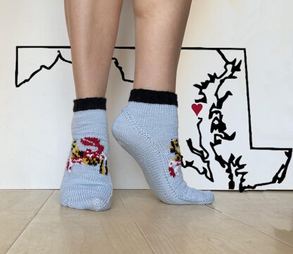 What better sums up Maryland than its state flag and Maryland Blue Crabs? Inspired by Elizabeth Zimmerman’s Moccasin Sock, the leg and top of the foot are worked first, then the toe, heel, and finally the sole of the foot.