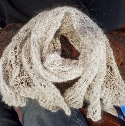 With larger yarn, the scarf should be knit on larger needles to maintain the open feel of the lacework, 8mm for fingering, 9mm for sport.