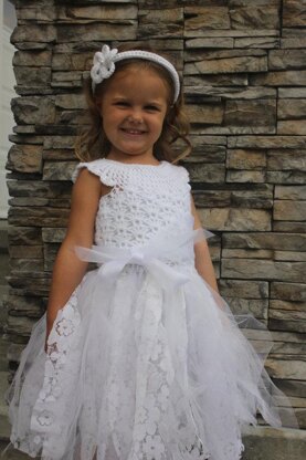 Whether it be for a wedding, First Communion, Christmas or a special party, this lovely dress is perfect! Strips of lace & tulle make up the tutu skirt. The bodice is crocheted with an iridescent yarn and embellished with iridescent pearls. Simply sweet!!! This dress is worked in two pieces for more versatility. The top is darling with a different bottom.