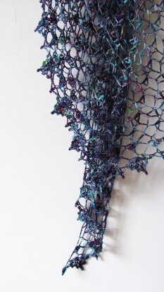 Masquerade is a triangle-shaped shawl crocheted from the top down. Voluminous puff stitches meet crochet mesh to create a richly textured yet lacy and airy fabric. This project needs hard blocking to open up the lace pattern.