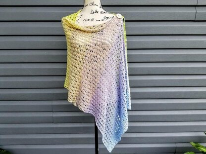 You can create a poncho with a simple button, a wrap for around your shoulders, a beach cover up when secured at the chest with a button or wrapped around your waist, or a light and lacy super scarf. This pattern is easy, fun, and you aren’t limited to using it just one way…you can use them all without any major conversions. This would also make a great gift for the upcoming holiday season!